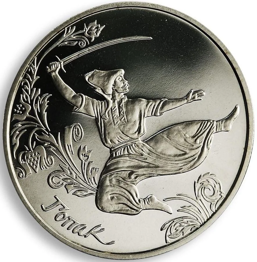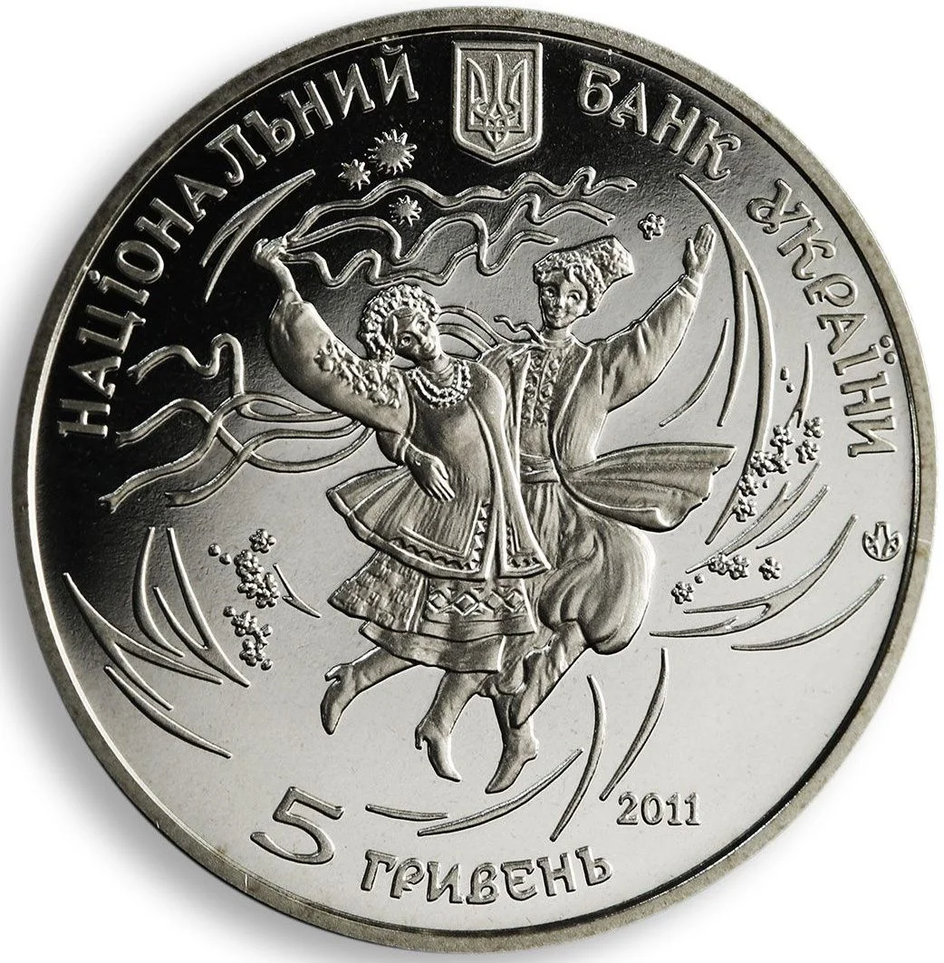 Description: The obverse features the Small Coat of Arms of Ukraine, the inscription "НАЦІОНАЛЬНИЙ БАНК УКРАЇНИ," and a stylized dancing couple. The reverse shows "П'ЯТЬ ГРИВЕНЬ," the year 2011, and the Mint logo.