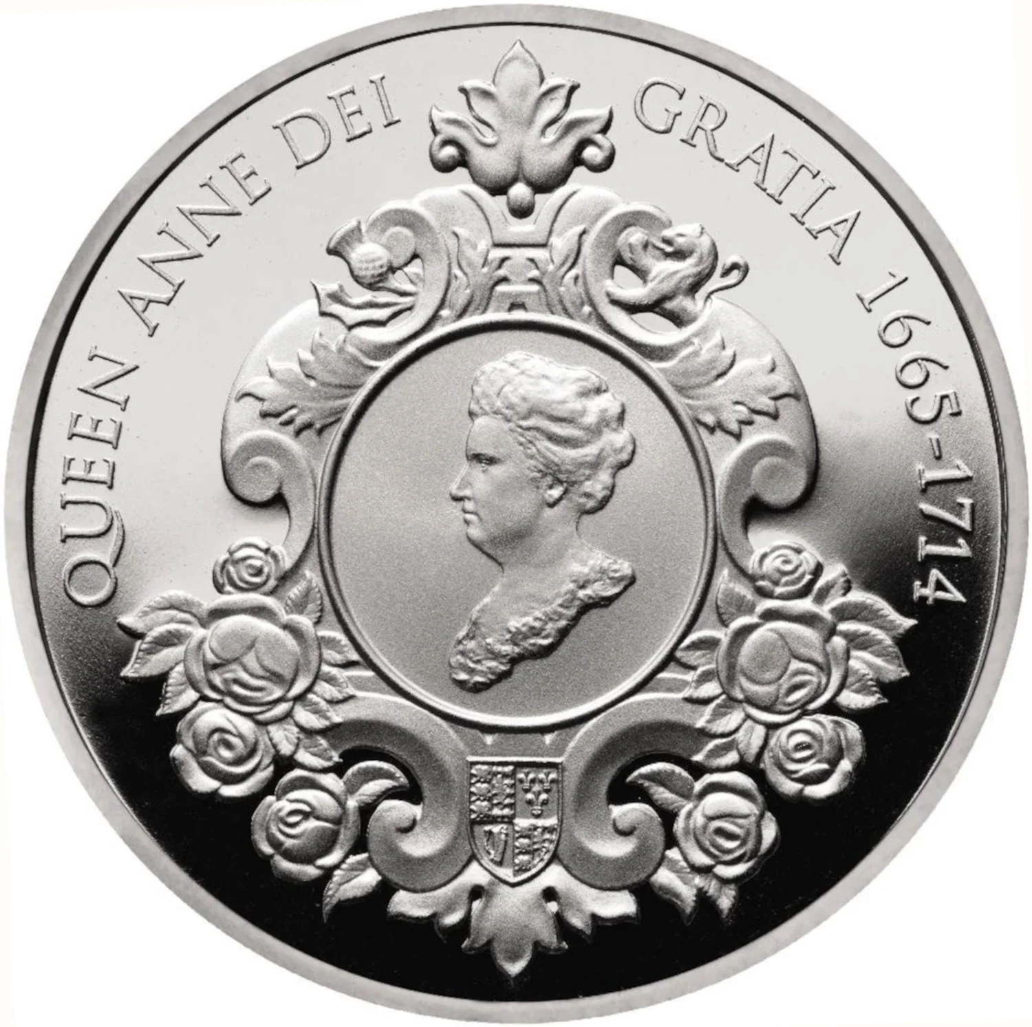 Portrait of Queen Anne left, framed ornately with Royal Arms and a legend above.