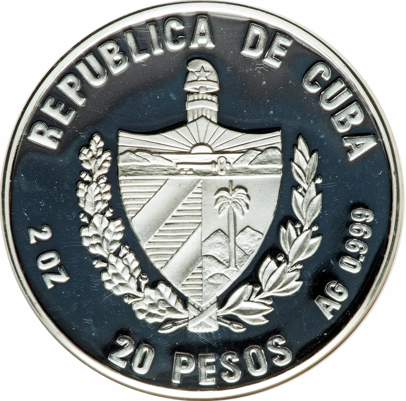 Cuban coat of arms with country name above, face value below, and weight/fineness on the sides.