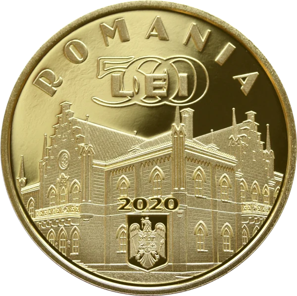 “Alexandru Ioan Cuza” Palace, arched “ROMANIA” inscription, “500 LEI” face value, Romanian coat of arms, and issue year “2020”.