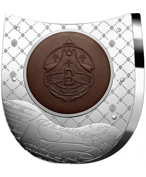 The Berluti emblem appears on a leather insert, patinated by their craftsmen and crimped during the coin's striking. The protective heel iron is engraved with the Scritto, honoring the House's calligraphic artistry.