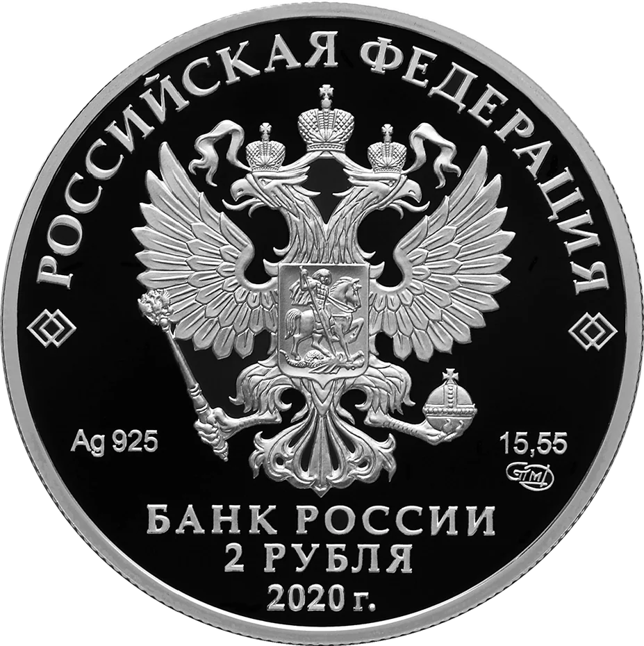 The obverse features the Russian Federation coat of arms with "РОССИЙСКАЯ ФЕДЕРАЦИЯ" above, framed by doubled rhombuses. Below are the metal specifications and mint mark. The bottom center reads "БАНК РОССИИ", "2 РУБЛЯ", and "2020 г."