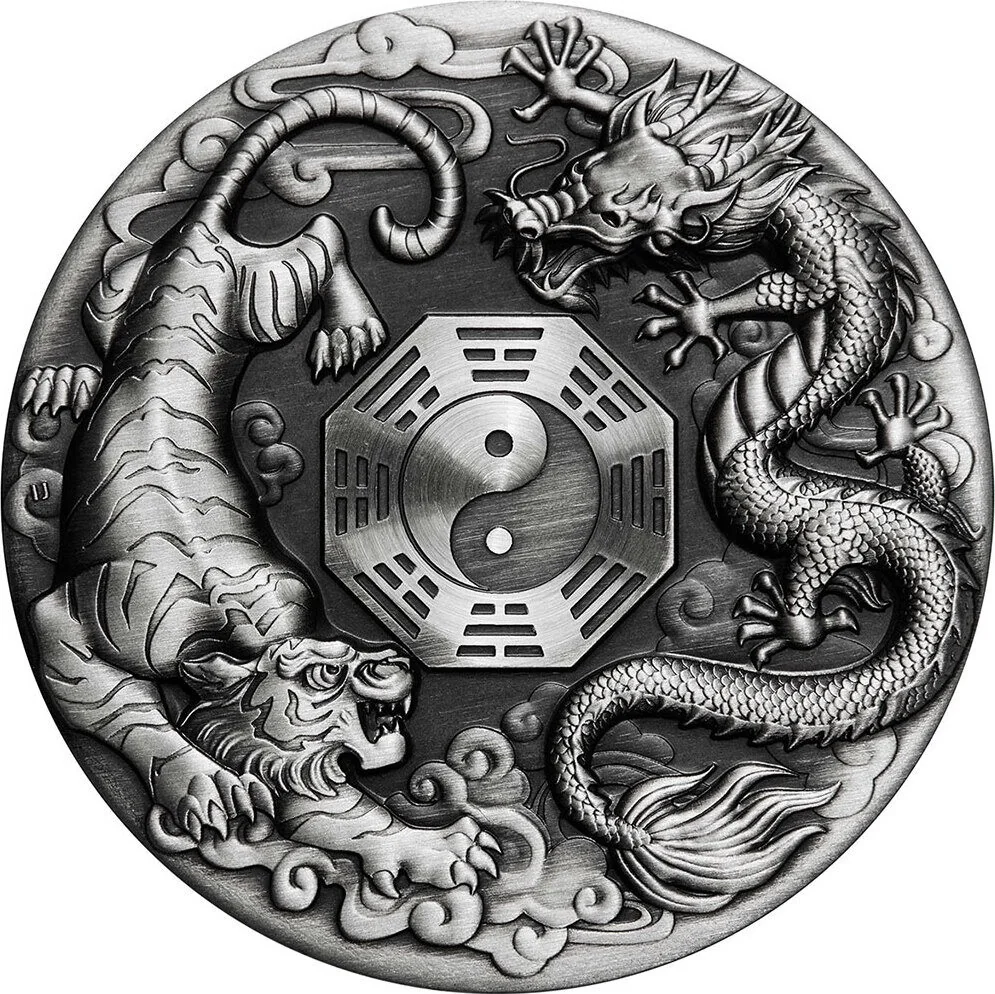 A dragon and tiger encircling a bagua.