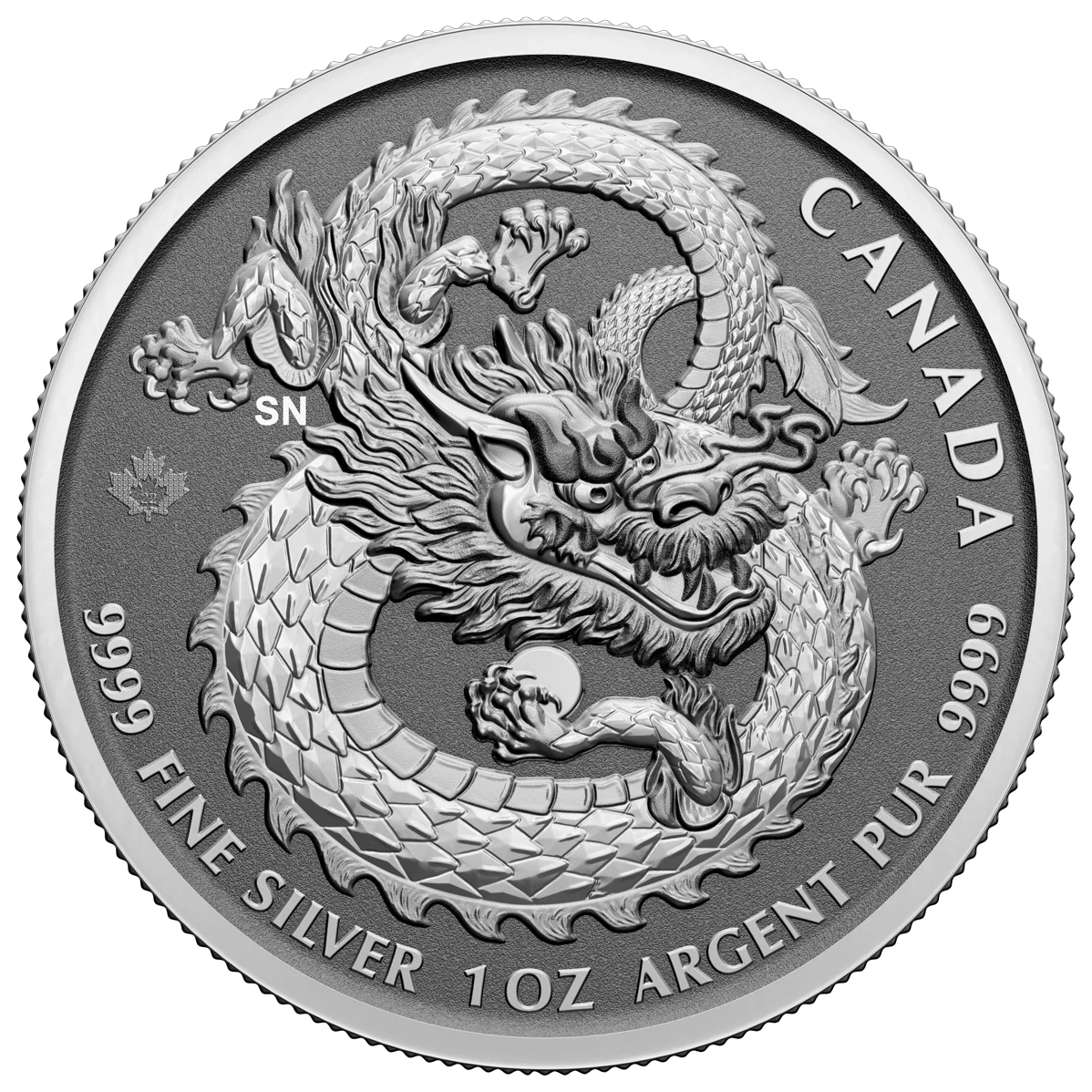 The 2018 Canadian Lucky Dragon silver coin features a dragon coiled into an eight, clutching a pearl. Simon Ng's initials (SN) are in the nape near the left foot.