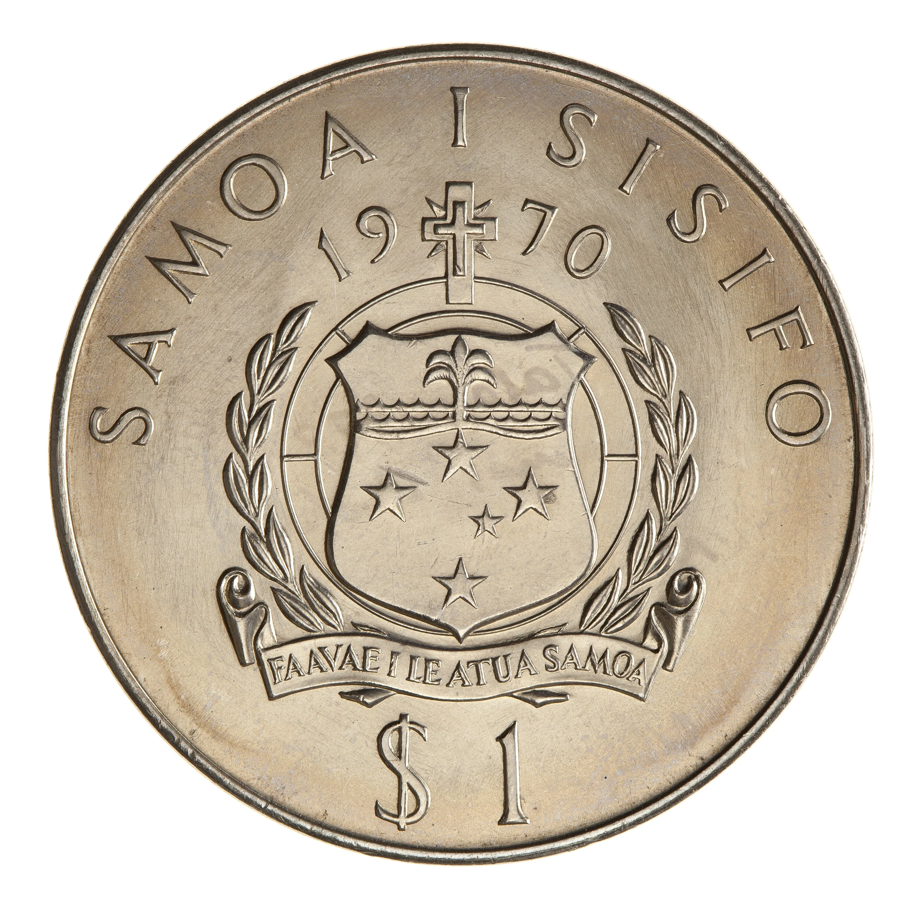 Samoa's coat of arms divides the date and denomination.
