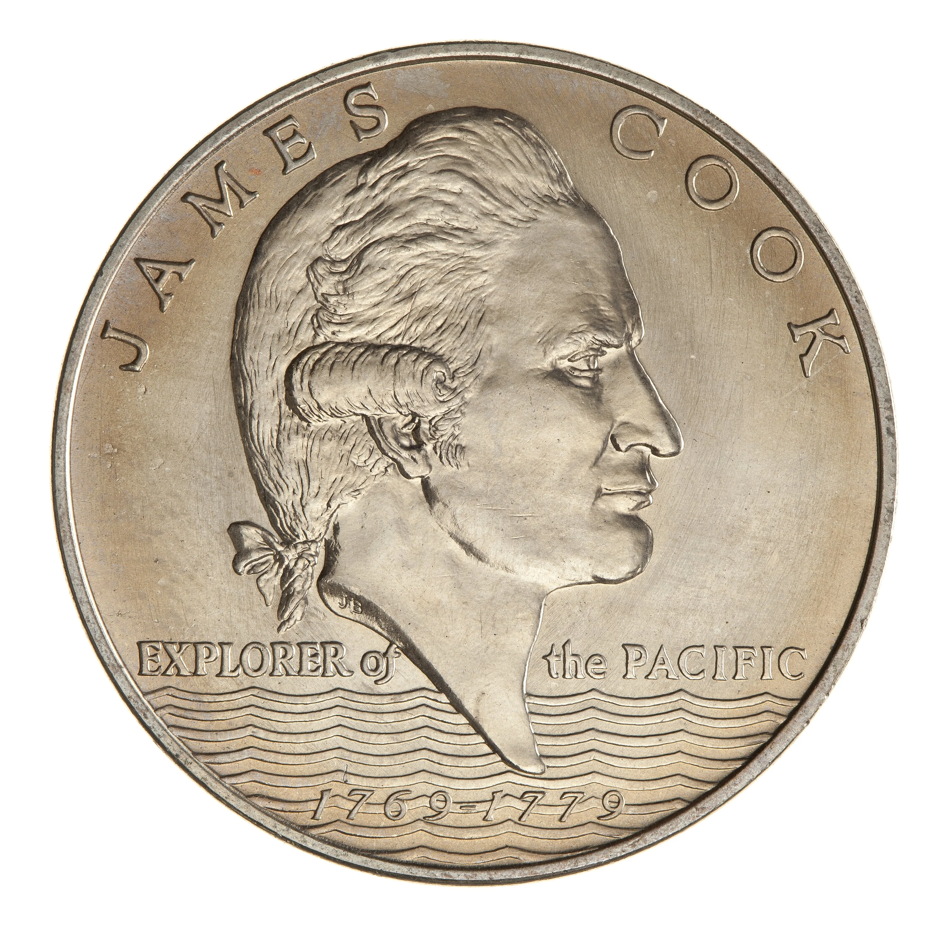 Captain James Cook facing right, with waves below.