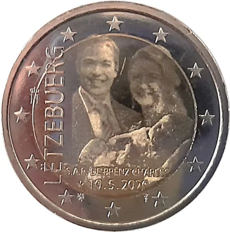 The centre depicts Prince Charles with his parents, Hereditary Grand Duke Guillaume and Hereditary Grand Duchess Stephanie. Below is the text ‘S.A.R. de Prënz Charles’ and his birth date ‘10 May 2020’. Vertically at the left is ‘LËTZEBUERG’. The monogram of Grand Duke Henri (crowned ‘H’) and the 12 stars of the European flag complete the design.
