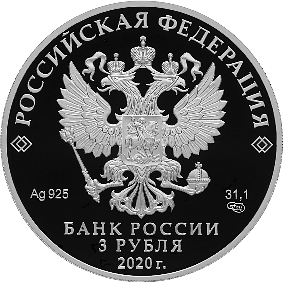 The obverse features the Russian Federation coat of arms with the inscription "РОССИЙСКАЯ ФЕДЕРАЦИЯ" above. Below are the metal specifications and mint mark, with "БАНК РОССИИ", "3 РУБЛЯ", and "2020 г." at the bottom.