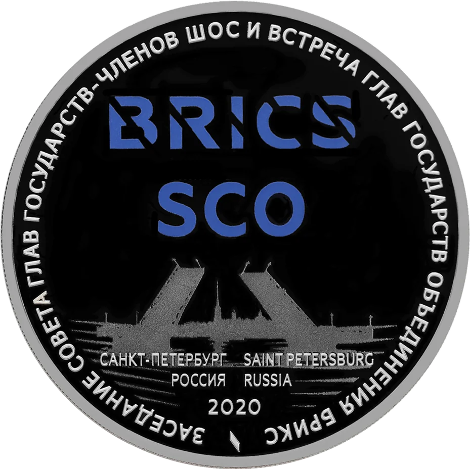 The mirror field features BRICS and SCO summit logos with the Palace Bridge and Peter and Paul Fortress. The rim reads: ‘SCO AND BRICS SUMMITS’. The bottom bears ‘SAINT PETERSBURG’, ‘RUSSIA’, and ‘2020’ in Russian and English.