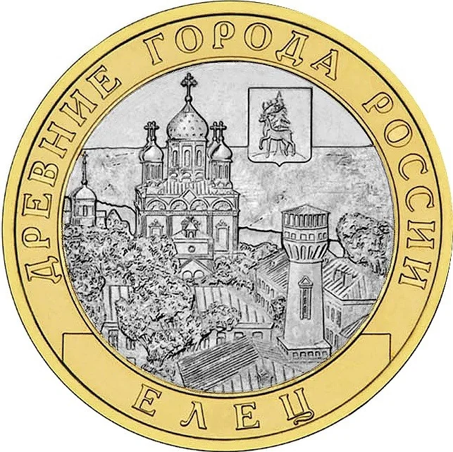 A panoramic view of Yelets, an ancient Russian town, with its coat of arms. The rim inscription reads: "ДРЕВНИЕ ГОРОДА РОССИИ" (top) and "ЕЛЕЦ" (bottom).