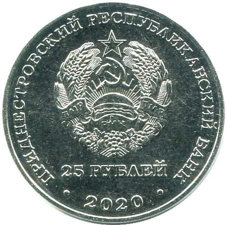 State Emblem of Transnistria. Circular inscription: top - "ПРИДНЕСТРОВСКИЙ РЕСПУБЛИКАНСКИЙ БАНК" (Transdniestrian Republican Bank), bottom - "25 РУБЛЕЙ" (25 Roubles). Below the emblem, the year "2020".