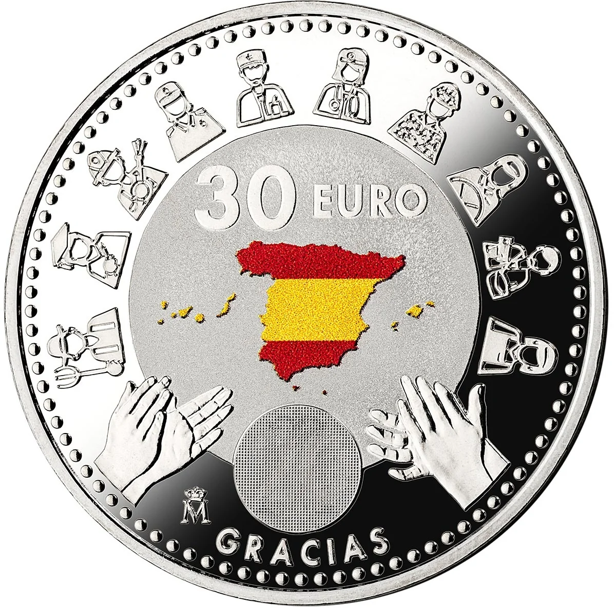 A map of Spain in the flag's colors. Within a central circle, a quadruple latent image shows the COVID-19 virus, the mint mark, two clapping hands, and the year "2020." It is surrounded by ten pictograms honoring essential workers. At the bottom, two pairs of hands clapping.