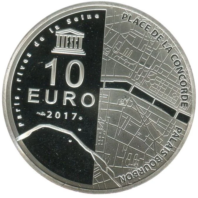 Right: Paris map marking Invalides and Grand Palais. Left: UNESCO logo, "10 EURO," and year.