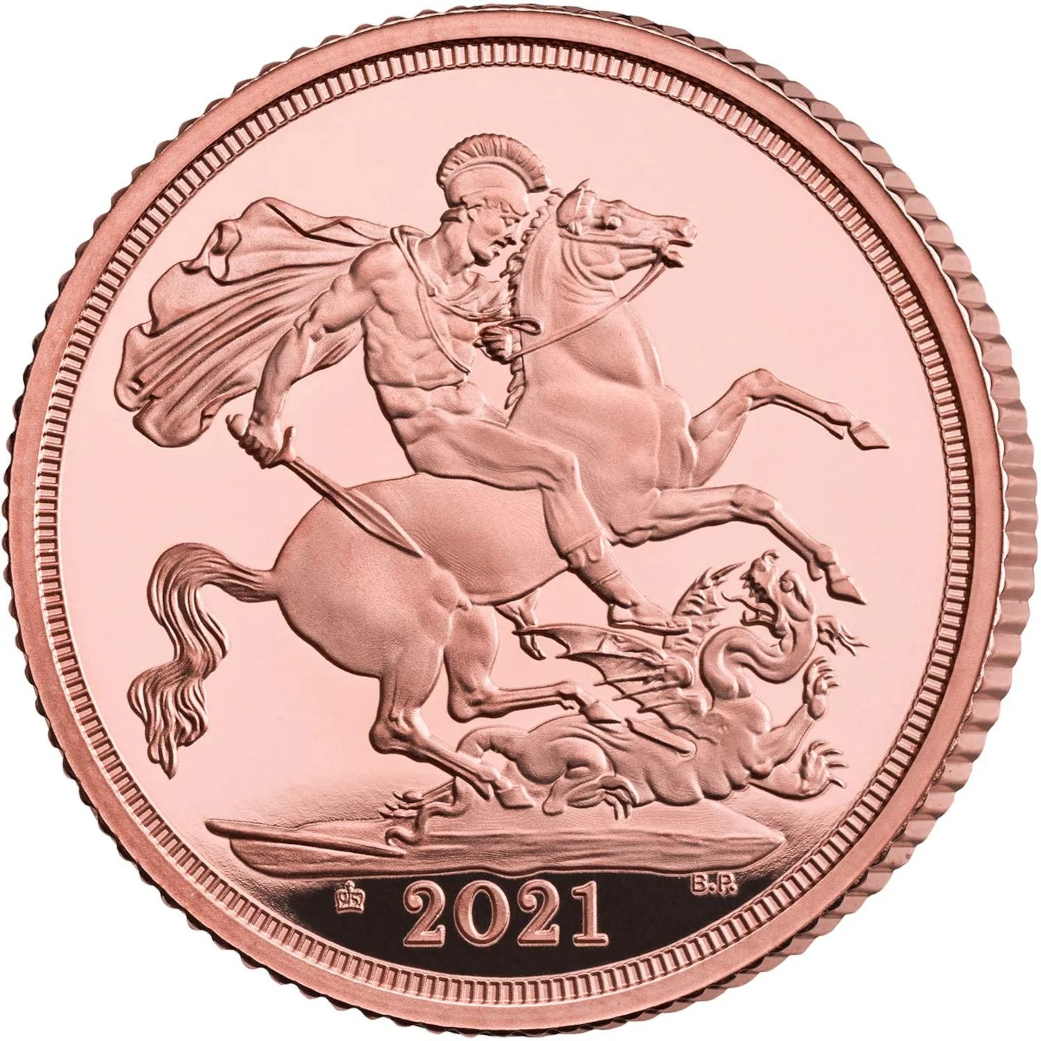 St. George slaying the dragon; crown privy mark, date, and designer's initials in exergue.