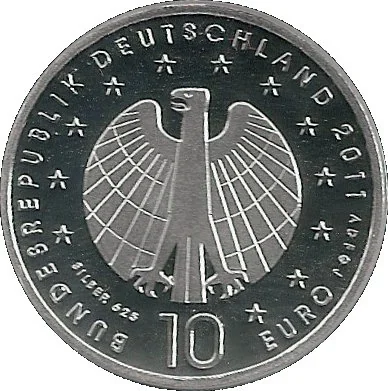 Description: The stylized federal eagle and EU stars are at the coin's center, surrounded by "BUNDESREPUBLIK DEUTSCHLAND", the year 2011, a mintmark (A, D, F, G, or J), and "10 EURO". "Silber 625" appears below to distinguish it from the cupronickel version.