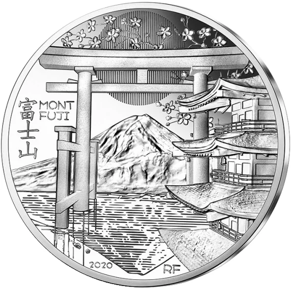 Foreground right: the Chureito pagoda overlooking Mount Fuji. A cherry blossom branch arches above. Center: a torii gate in water, framing Mount Fuji and its lake reflection. The Japanese sun symbol is at the top.