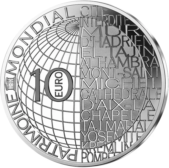 A UNESCO World Heritage globe, with site names on the right, the UNESCO logo on the left, and the face value inside. The reverse is a common design for the series.