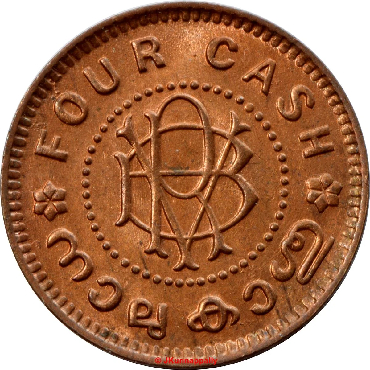"BRV" for Bala Rama Varma II (1924-1949). Value in English and Malayalam (Nalu Kashu).