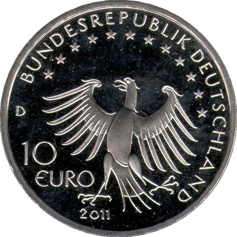 The coin's center features the stylized federal eagle under twelve EU stars. Surrounding this are "BUNDESREPUBLIK DEUTSCHLAND", the year "2011", the Munich mint mark "D", and the face value "10 EURO". The "Silber 625" inscription is omitted to distinguish it from the silver 625‰ version.