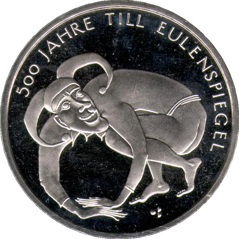Centered is Till the Mischievous, a German literary figure from 1511. Above, on the listel, is "500 JAHRE TILL EULENSPIEGEL." The artist's initials "FB" are below.