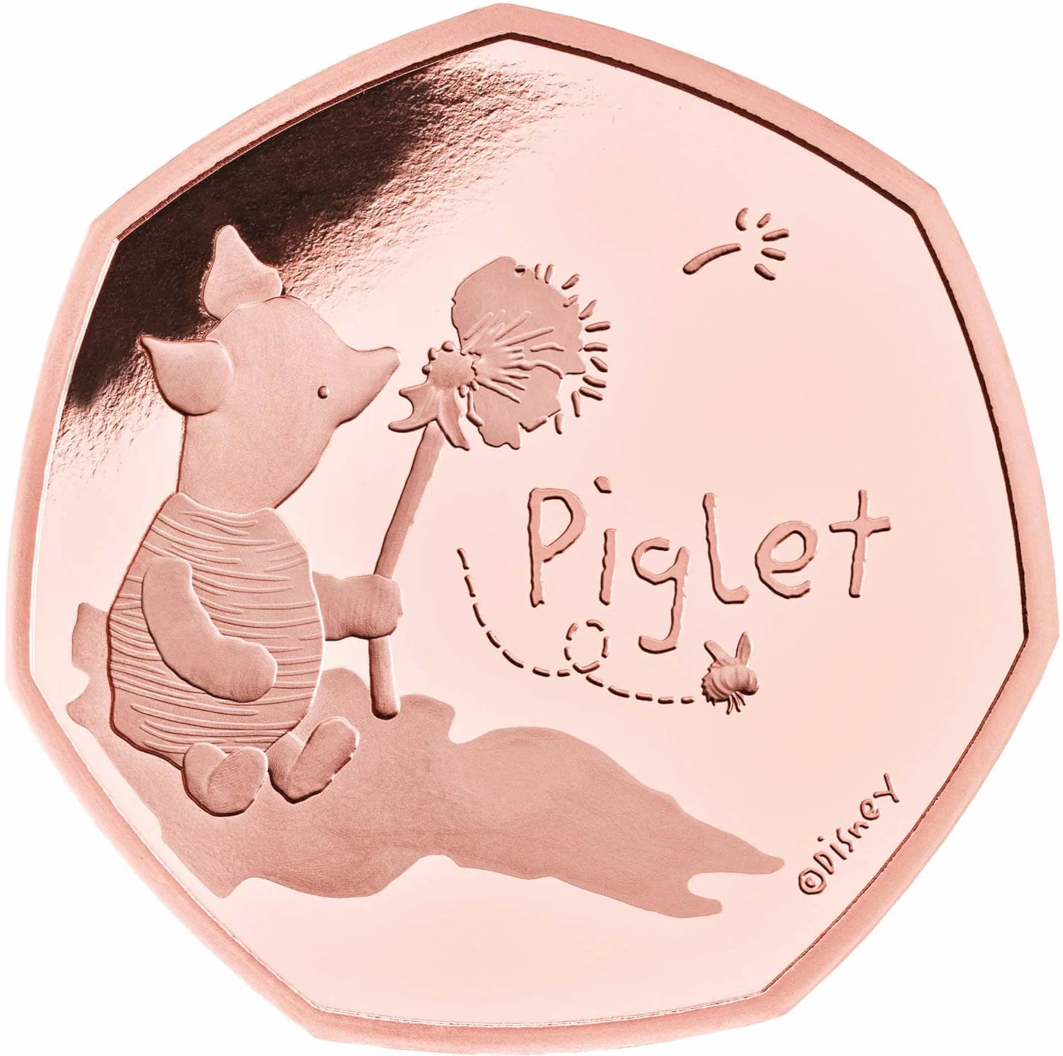 Piglet blows a dandelion as a bee buzzes nearby.