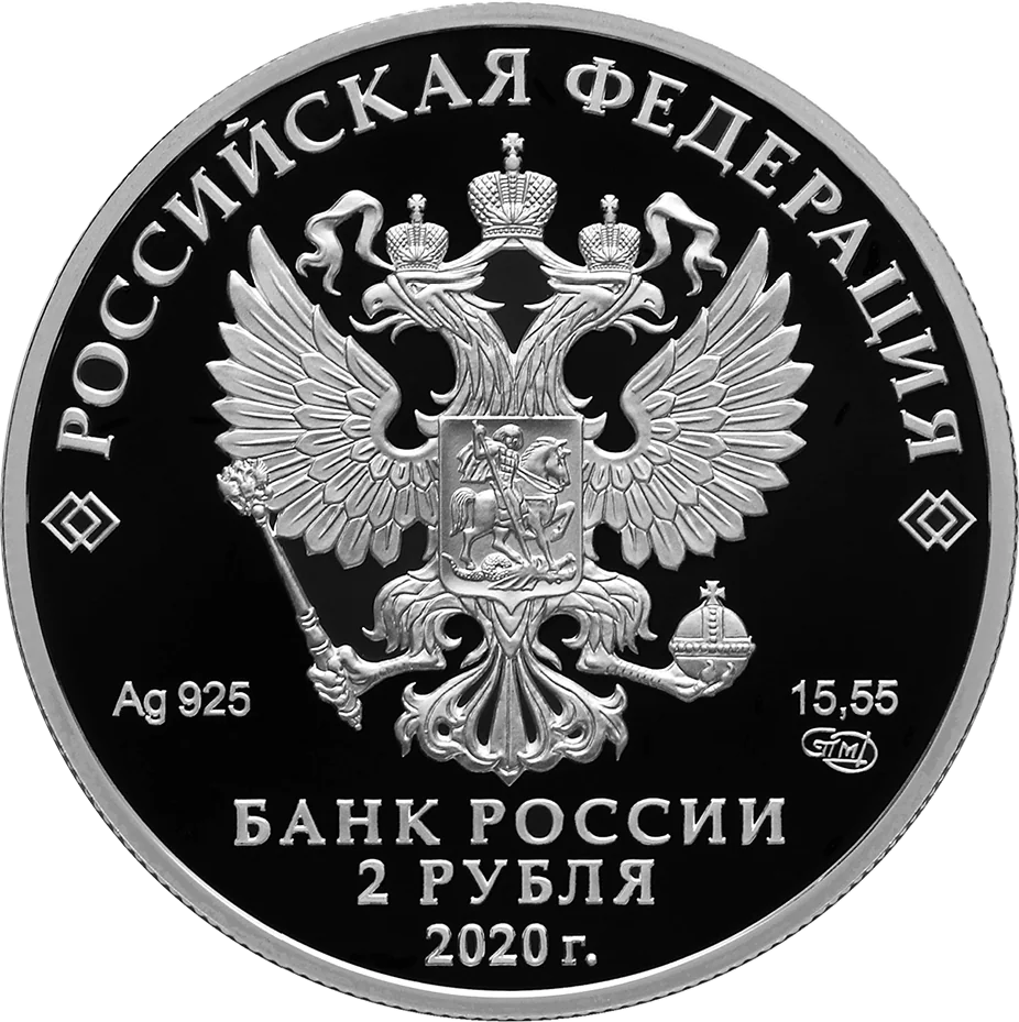 The obverse features the Russian Federation coat of arms with "РОССИЙСКАЯ ФЕДЕРАЦИЯ" above, framed by doubled rhombuses. Below are the metal specifications and mint mark. The bottom center reads "БАНК РОССИИ", "2 РУБЛЯ", and "2020 г."