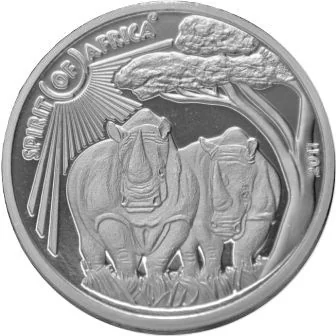 The reverse features a detailed image of two rhinos with the inscriptions "SPIRIT OF AFRICA" and "2017".