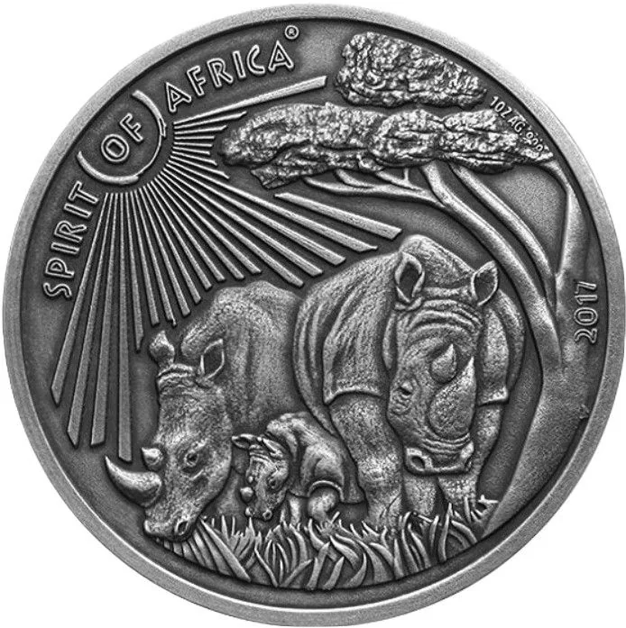 The reverse features three detailed rhinos with the inscriptions "SPIRIT OF AFRICA" and the issue year "2017".