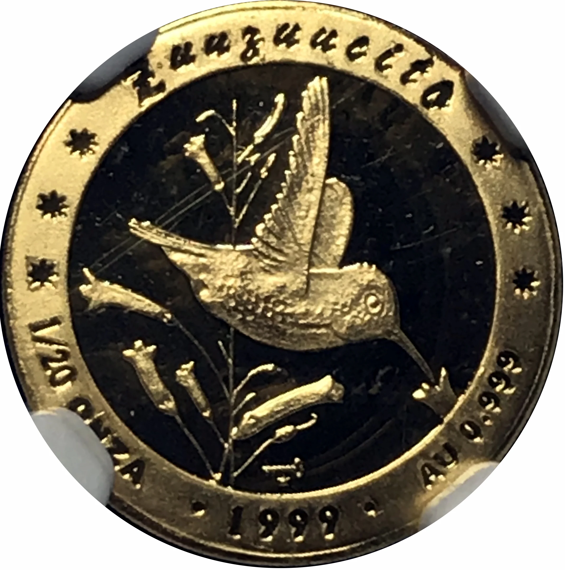 Zunzuncito (Bee Hummingbird) in flight, feeding from a flower. Weight and fineness on sides; date below mintmark.
