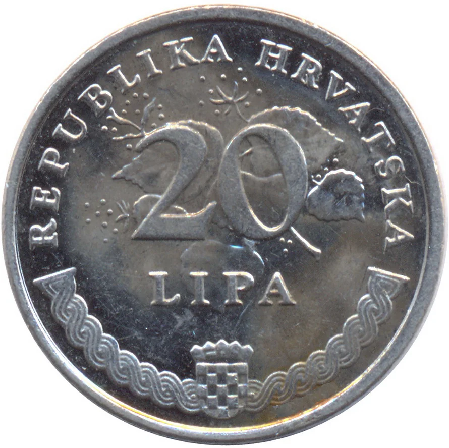 A stylized linden branch with flowers and numeral values on leaves, "LIPA" below, the country name above, and the Croatian coat of arms between braided ornaments at the bottom.
