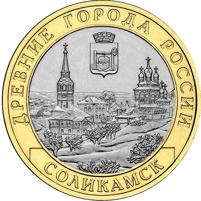 Coat of arms of Solikamsk above a town panorama. Encircling text: "ДРЕВНИЕ ГОРОДА РОССИИ" (ANCIENT TOWNS OF RUSSIA) and "СОЛИКАМСК" (SOLIKAMSK).