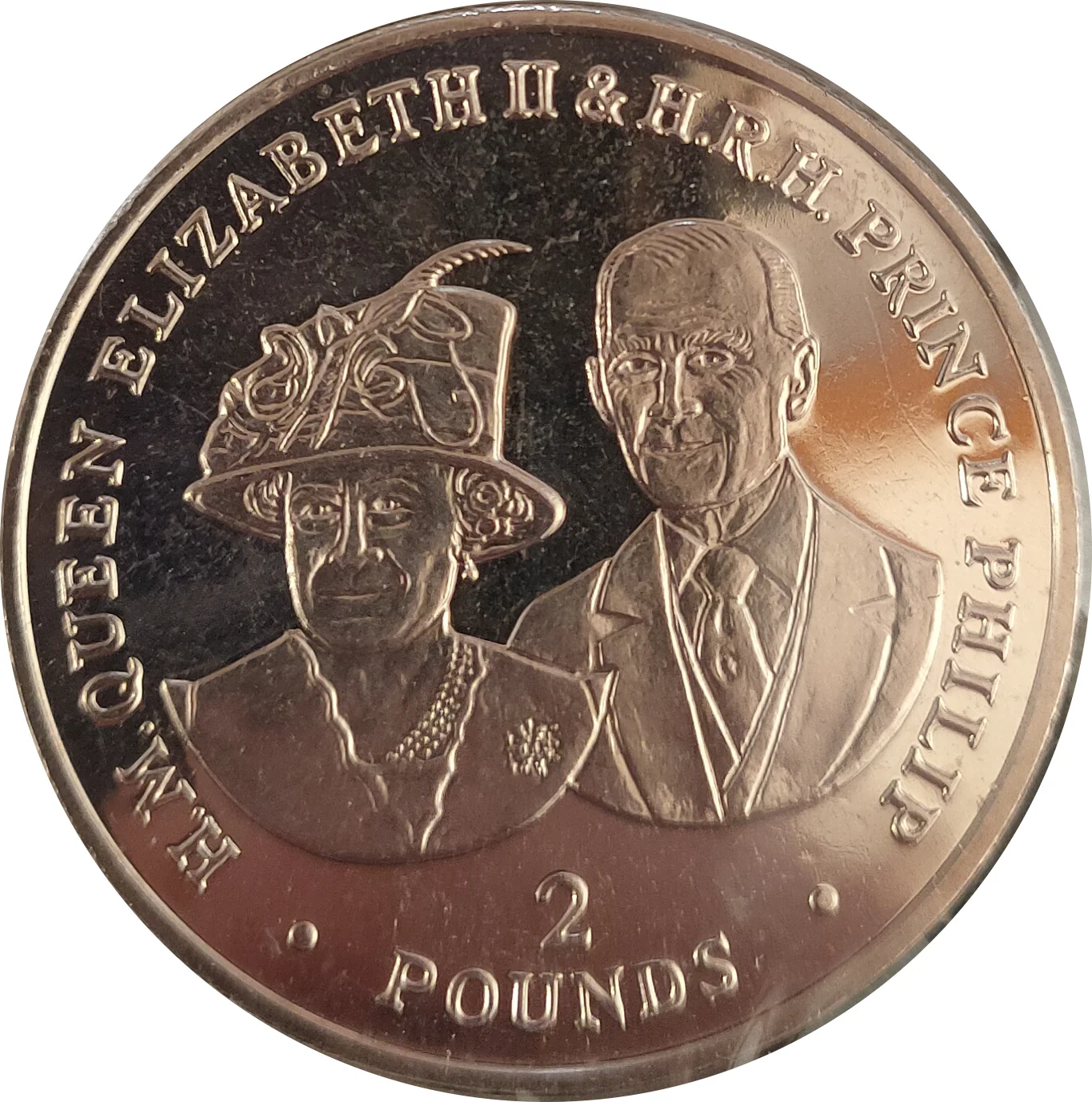 Profile of Queen Elizabeth II and Prince Philip, PM mintmark near her back.