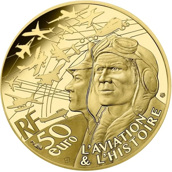 Two pilots embody civil and military aviation across eras, with diverse aircraft filling the sky in tribute to flight history. The reverse features the face value and "RF" symbol.