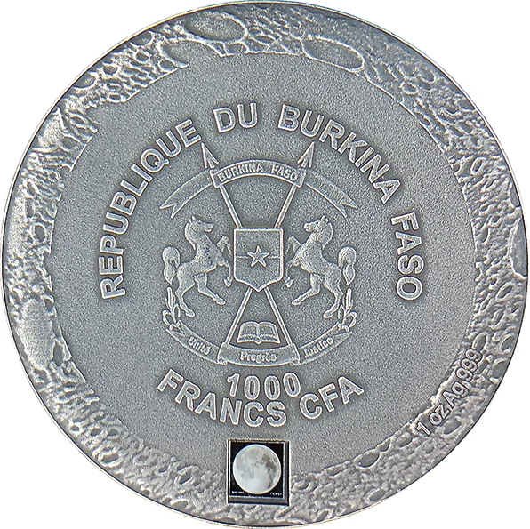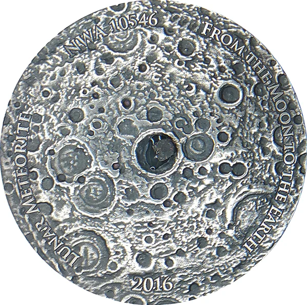 Description: The reverse shows the moon's surface with impact craters and a central meteorite, surrounded by the inscriptions: "FROM THE MOON TO THE EARTH", "2016", "LUNAR METEORITE", and "NWA 10546".