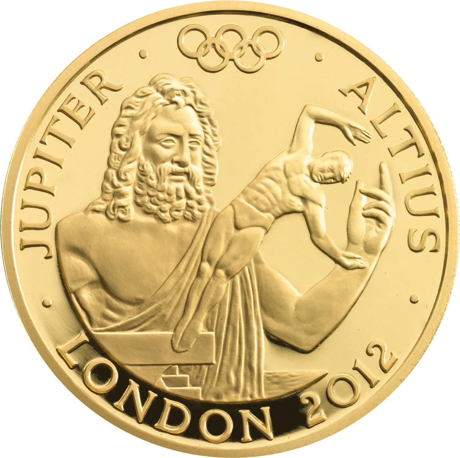Jupiter with a diving scene, Olympic Rings above, encircled by legend.