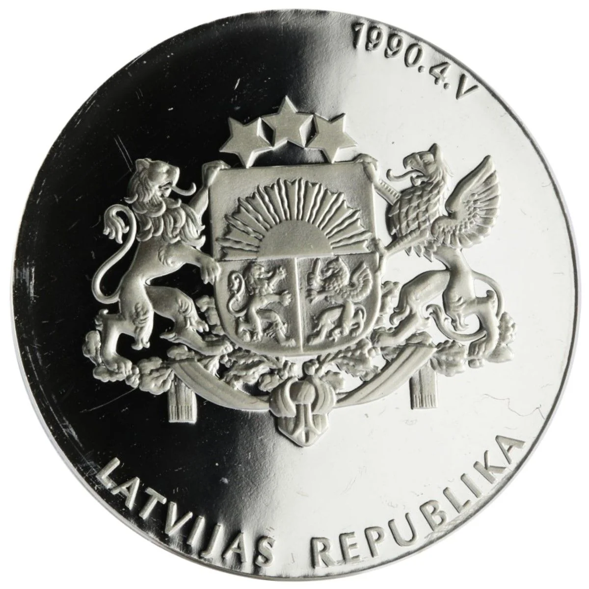 Centered is Latvia's large coat of arms, with "1990.4.V" in a semicircle above it and "LATVIJAS REPUBLIKA" in a semicircle below.