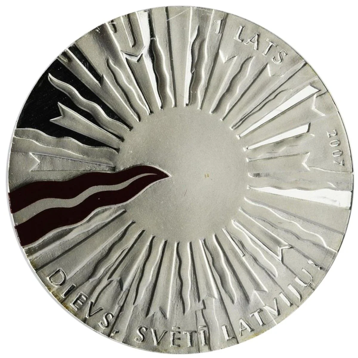 The sun's beams form Latvia's flag at bottom left. "1 LATS" arcs top right with 2007 below. "DIEVS, SVETI LATVIJU!" arcs at the bottom.