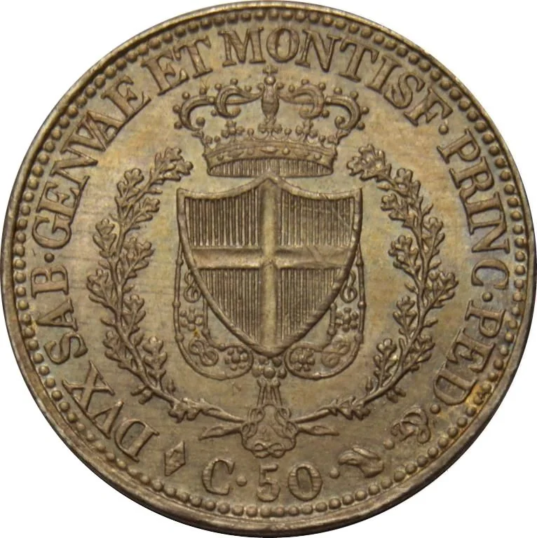 Crowned Savoy shield between oak branches, with order collar below; "C.50" and mintmarks at bottom.