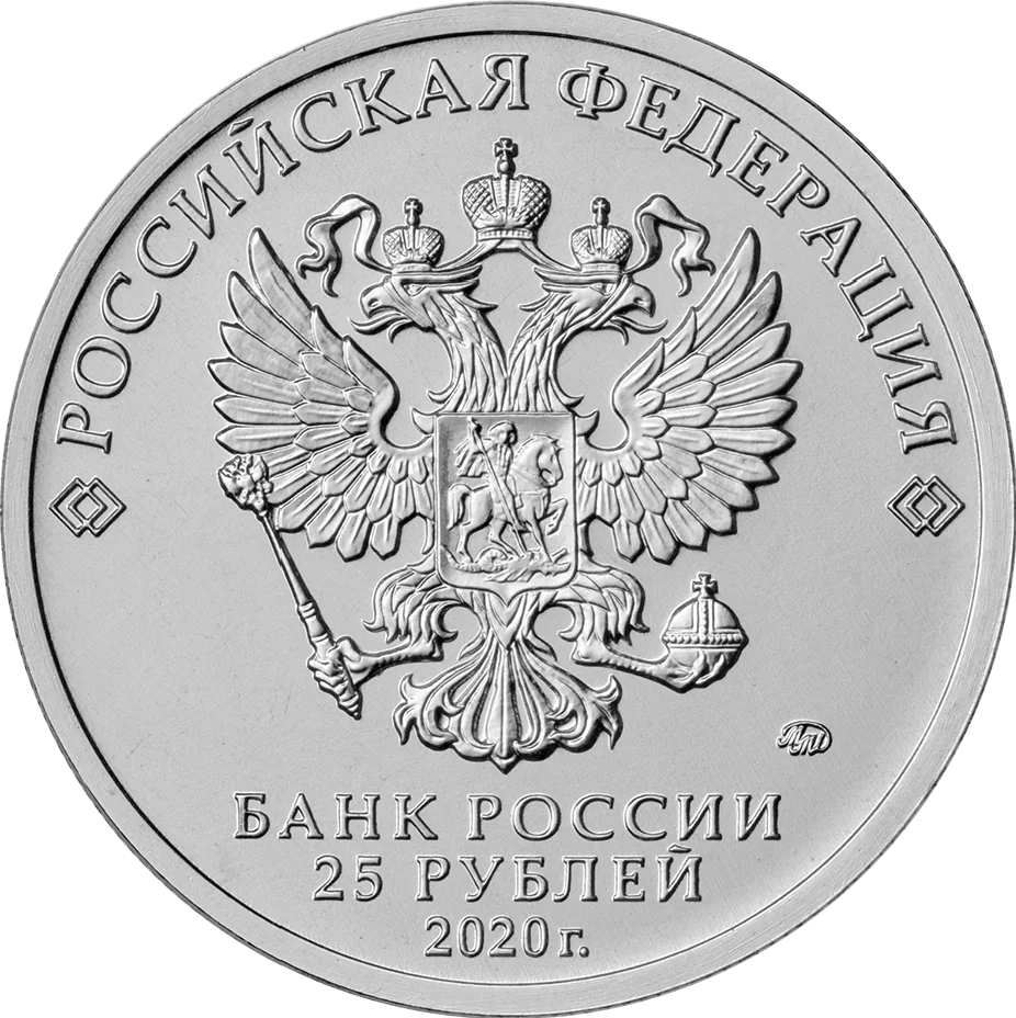 Centered is the national coat of arms, above it a semicircular inscription: "РОССИЙСКАЯ ФЕДЕРАЦИЯ", flanked by doubled rhombuses. Below are "БАНК РОССИИ", "25 РУБЛЕЙ", "2020 г.", and on the right, the mint mark.