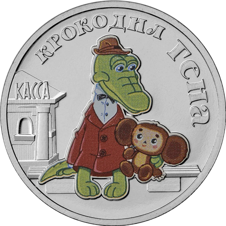 A color image of 'Gena the Crocodile' characters, with a relief ticket office on the left and the title 'КРОКОДИЛ ГЕНА' along the top right rim.