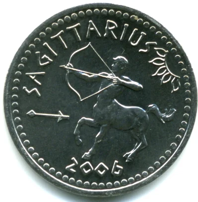 Archer with bow, zodiac symbol left, date below.