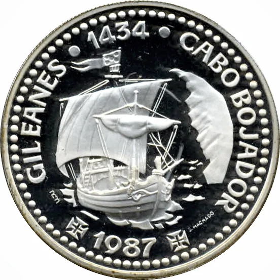 Square-rigged caravel sailing along a coast, surrounded by the name Gil Eanes, the first Portuguese sailor to round Cabo Bojador, the event date, and the cape's name. Coin date below.