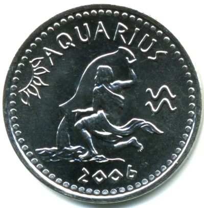 Aquarius pouring urn, zodiac symbol, date beneath.