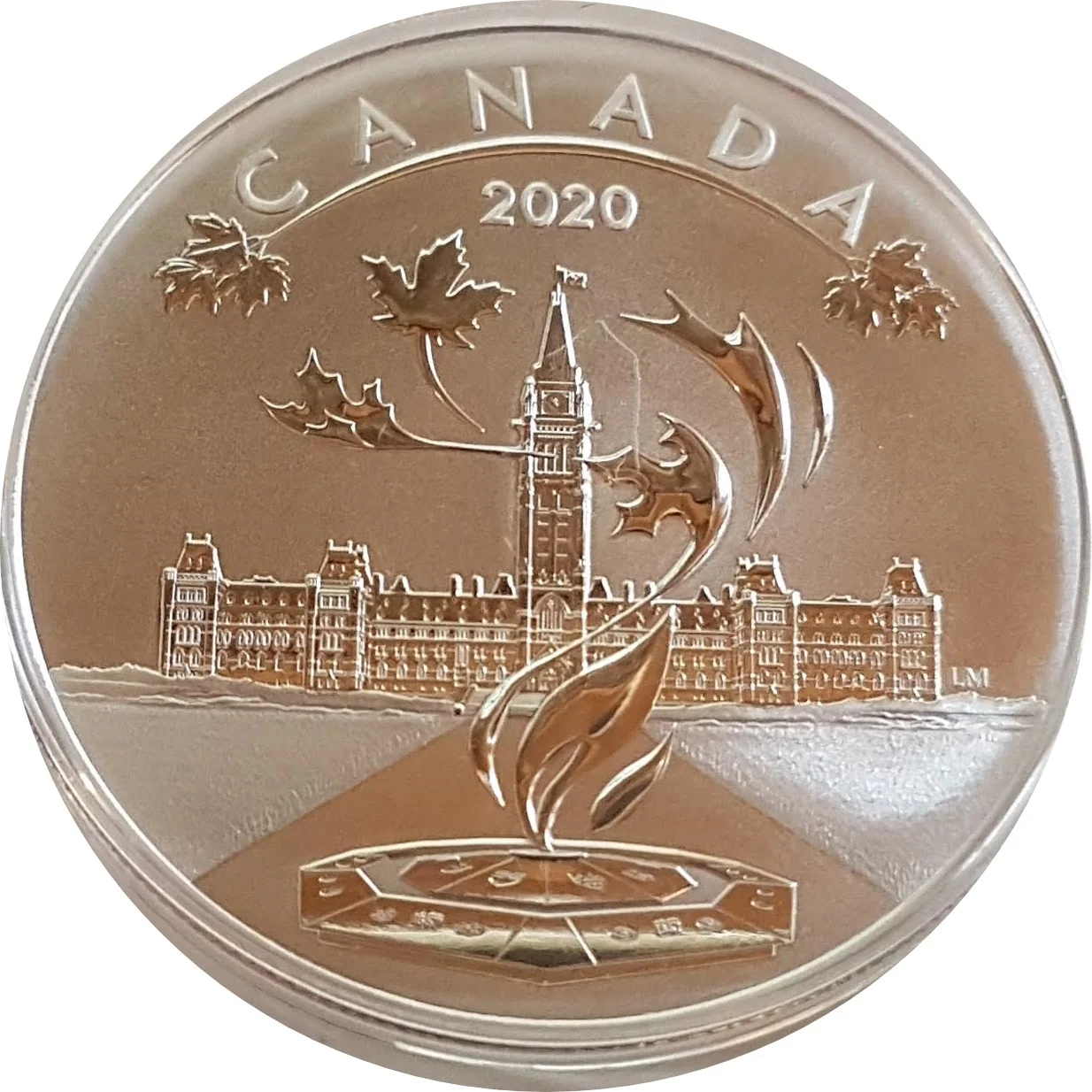 This reverse design by Laurie McGaw features Ottawa's Parliament Hill, including the Centennial Flame and Centre Block.