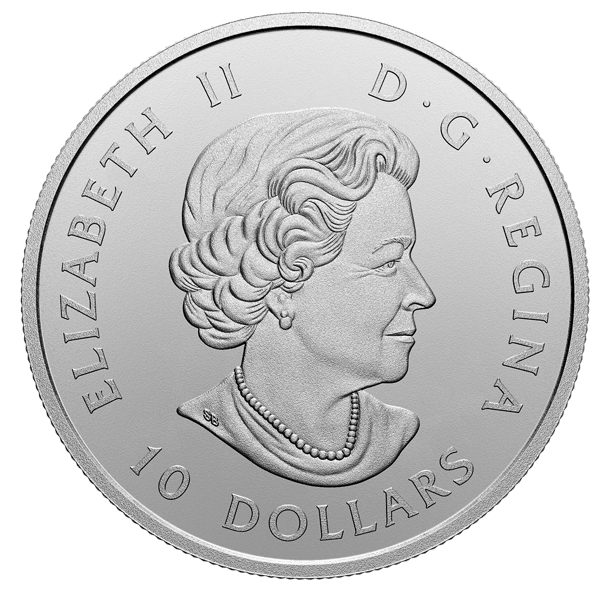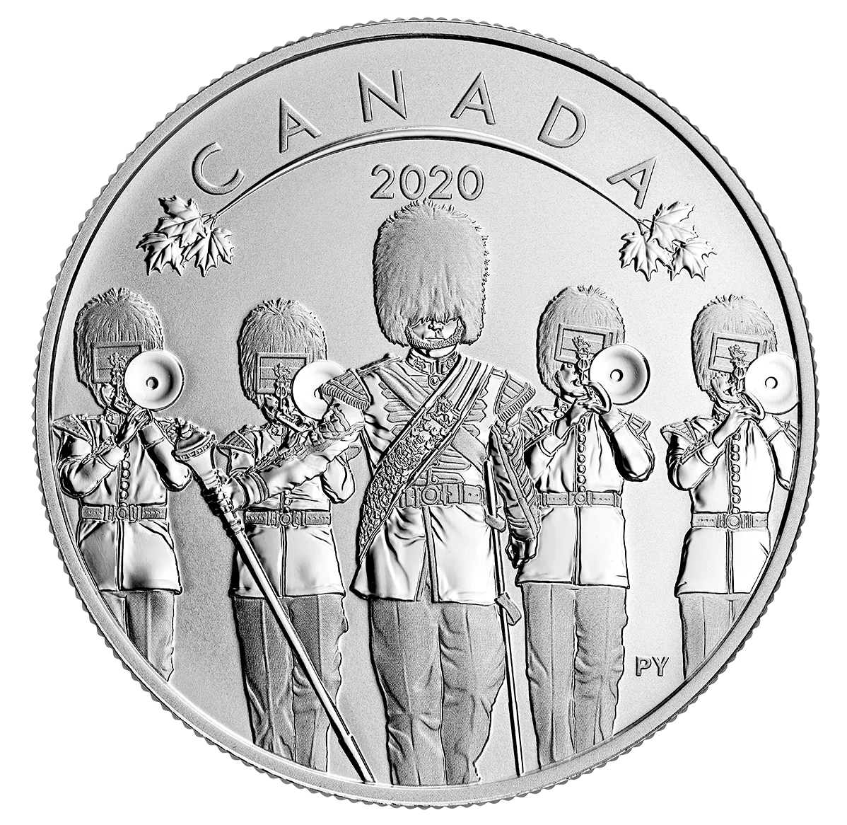 This reverse design by Pandora Young depicts a front view of Ottawa's Changing of the Guard, led by the Ceremonial Guard Band.