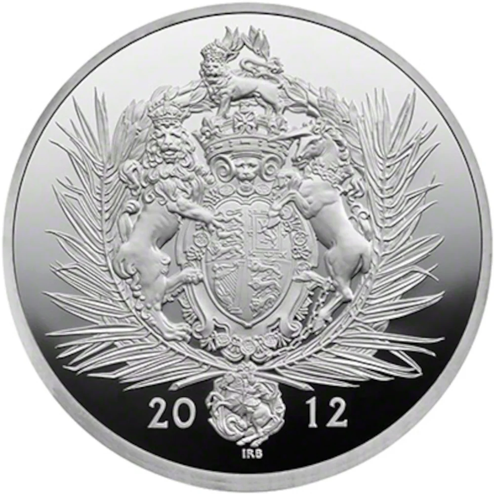 A full achievement of the Royal Arms, as displayed on the Buckingham Palace gates, with the date beneath.
