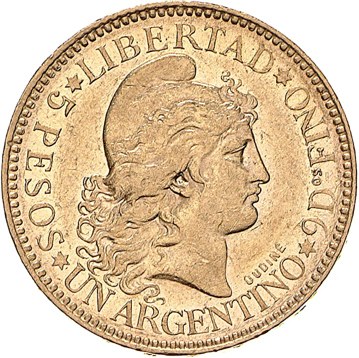 LIBERTY * 5 PESOS * ONE ARGENTINE * 9 D FINE *