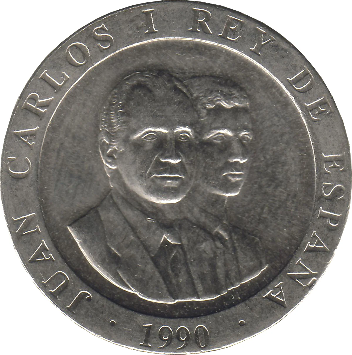 Conjoined busts of Juan Carlos I and Felipe facing right.