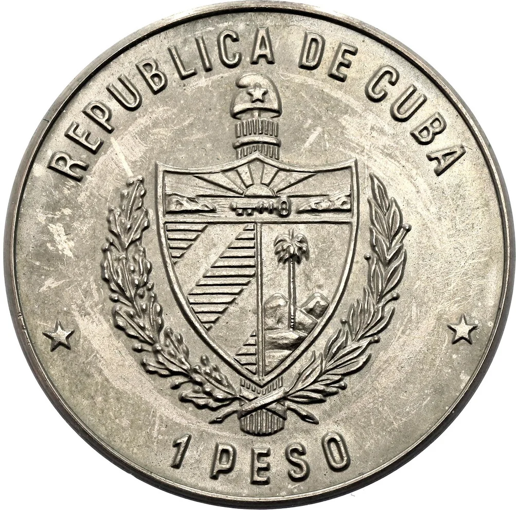 Cuban coat of arms with country name above, face value below, flanked by two five-pointed stars.