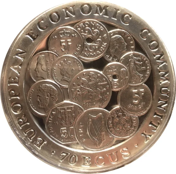 Twelve European coins encircling a central Gibraltar ECU coin.